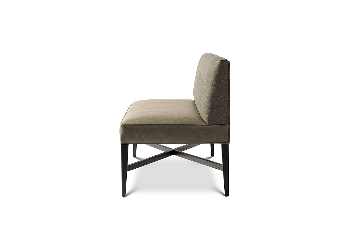Standard Features: Tight box seat (welt); pullover inside back with sewn modern tufts; welt along base and outside back; integral maple base with X cross stretcher
